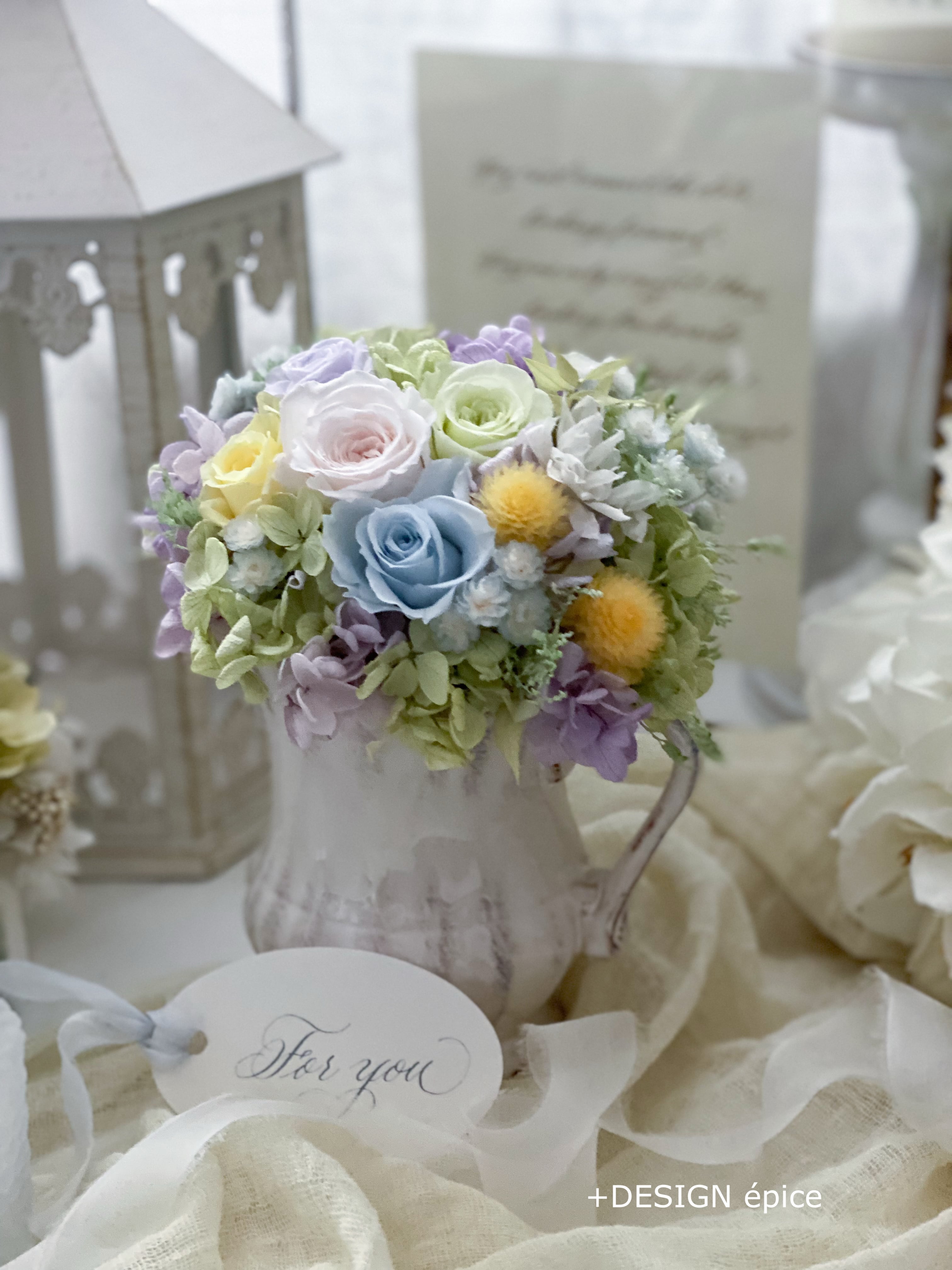 シャンパンピンクやイエロー、ラベンダーやライトブルーなど、色とりどりの春色のバラに紫陽花や、イモーテル、千日紅などのお花を合わせ、「Healing=癒し」のアレンジメントをお届けいたします。