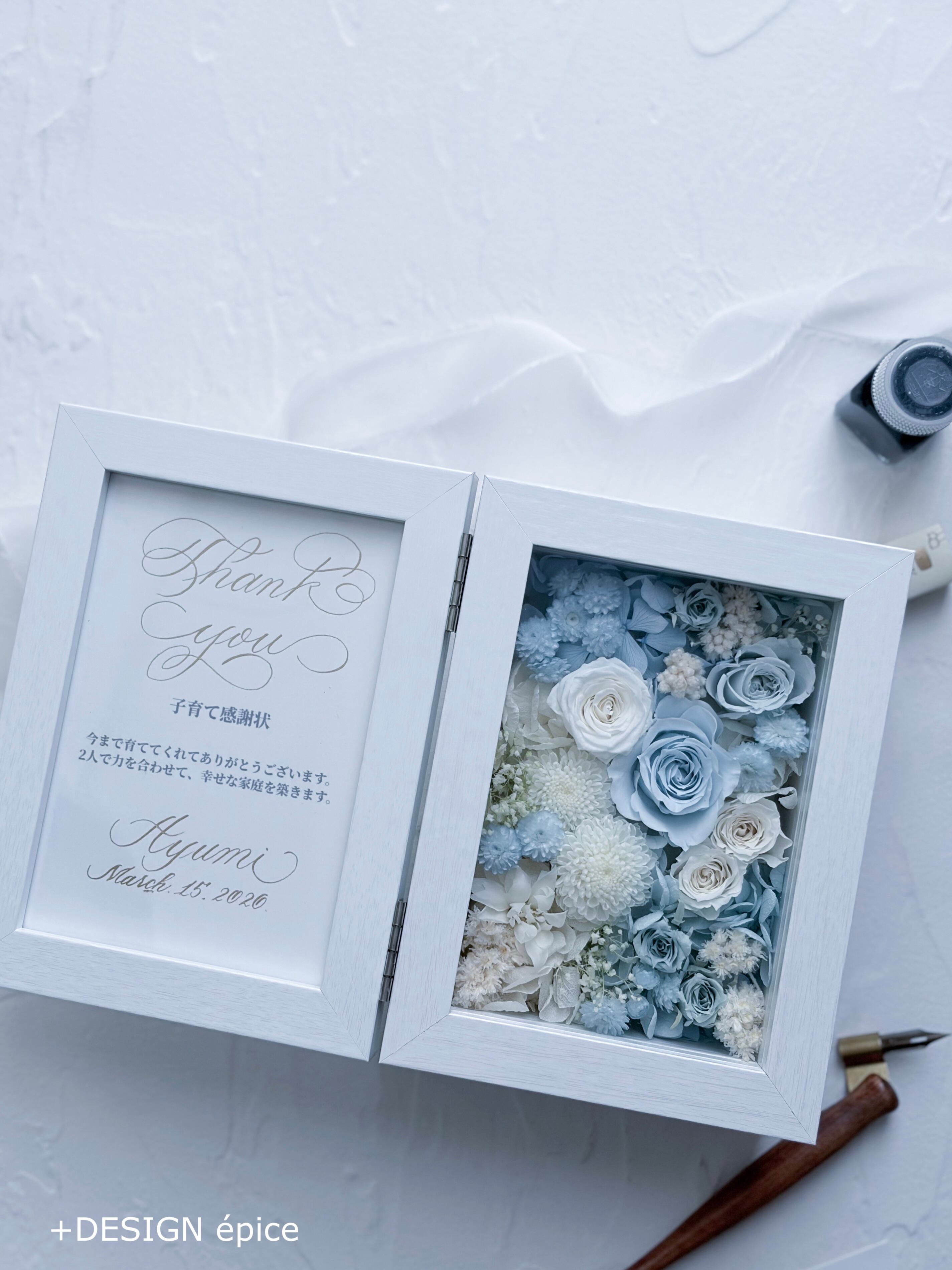 左のカリグラフィー側は写真を入れられますので、カリグラフィーカードから結婚式のお写真に替えて飾っていただけます。
