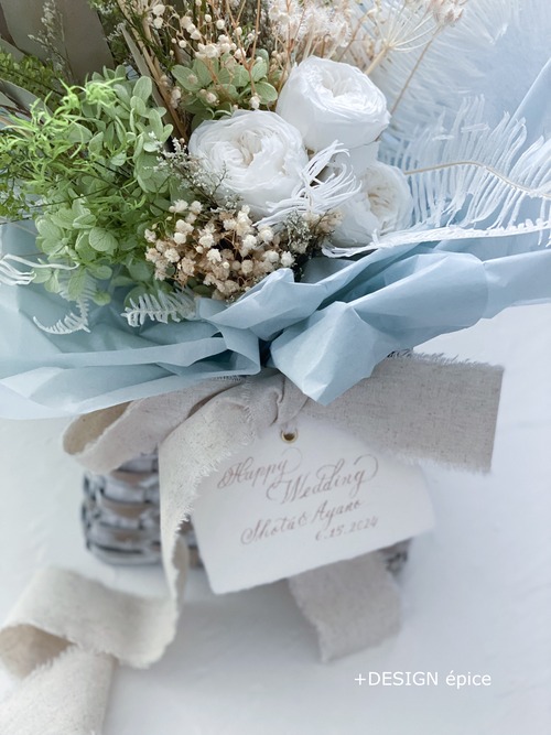 +アレンジ正面のリボン真ん中に手書きのエレガントなカリグラフィー文字でお名前、挙式日などお入れいたします。