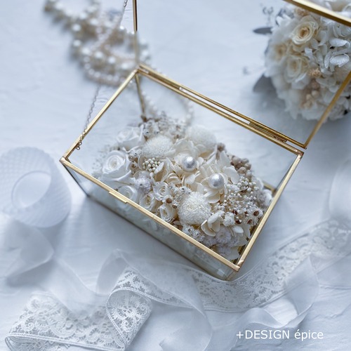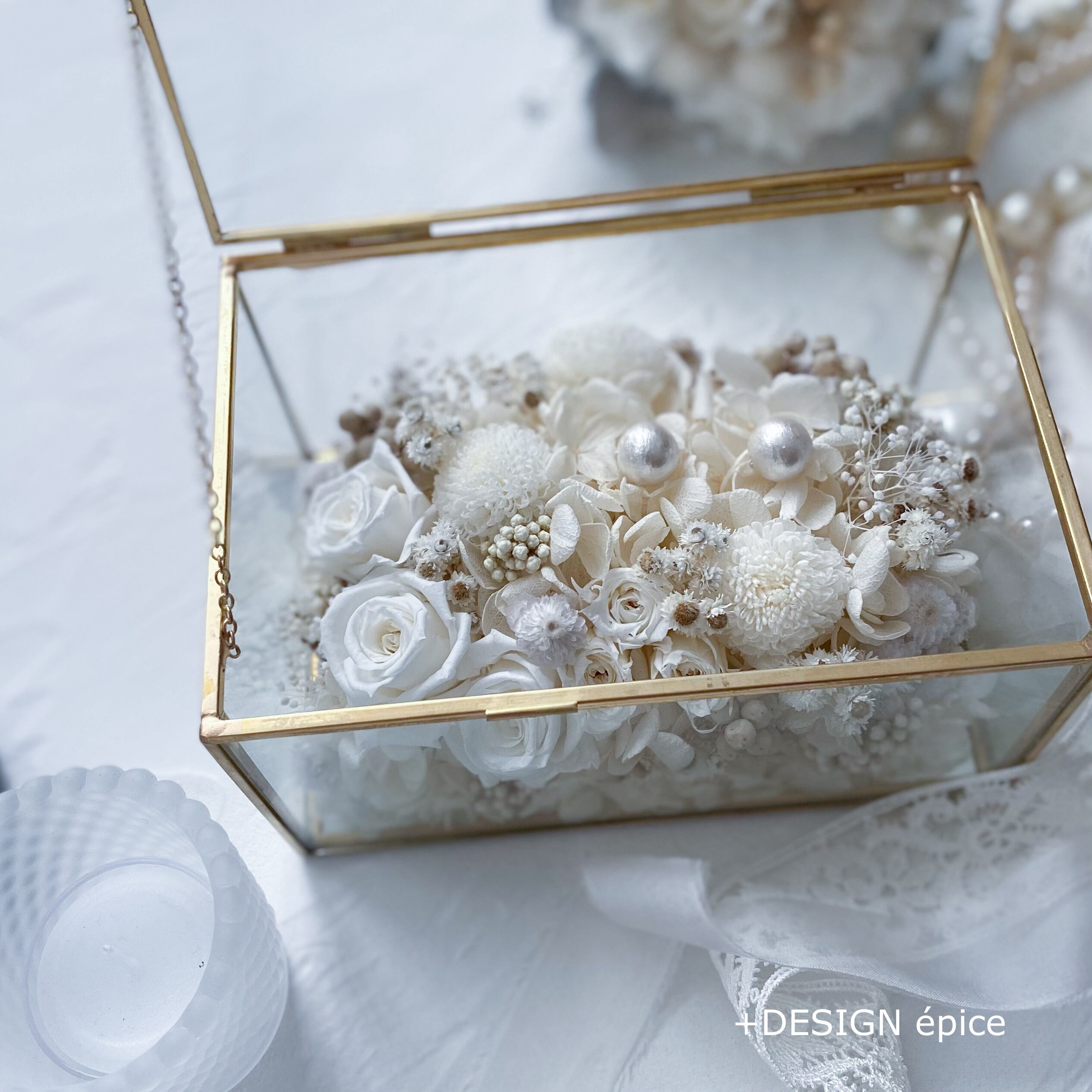 縁がゴールドのガラスケースにホワイトやアイボリーのバラ、紫陽花、小花達が寄り添うように咲き誇ります。