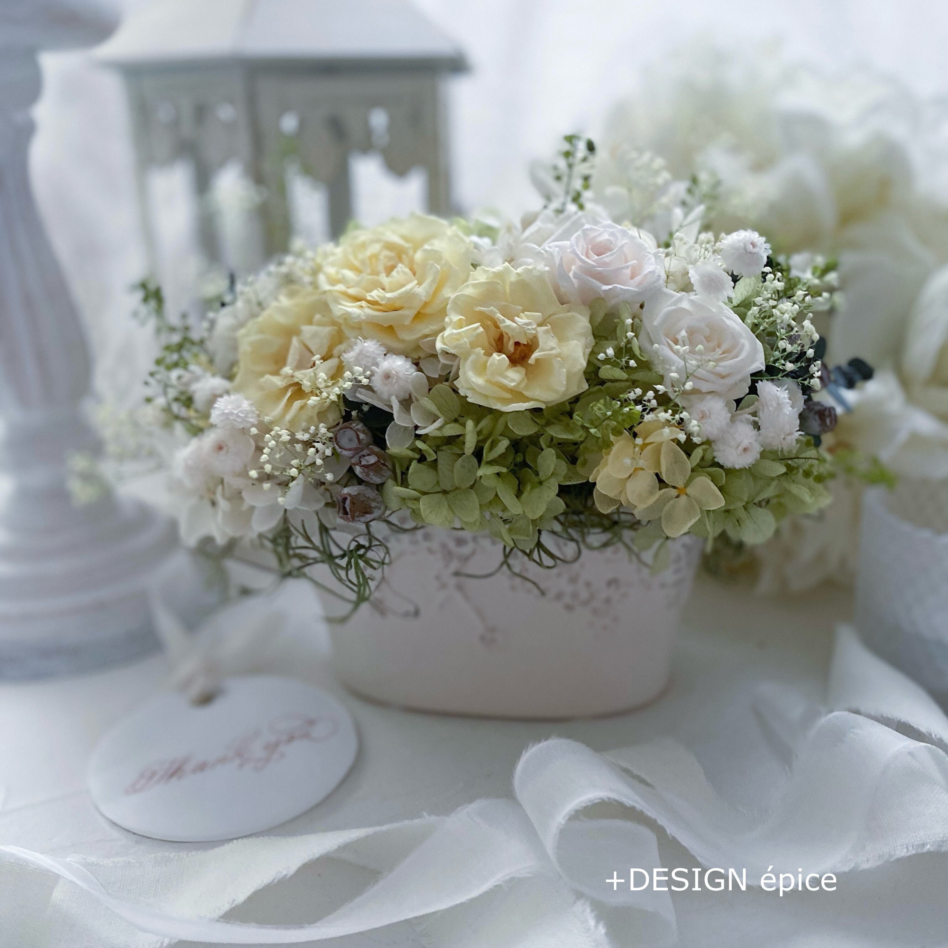 春の柔らかな風を感じるように、グリーンやかすみ草は少し長さを出して裾にもモスが垂れ下がるナチュラルなアレンジメント。