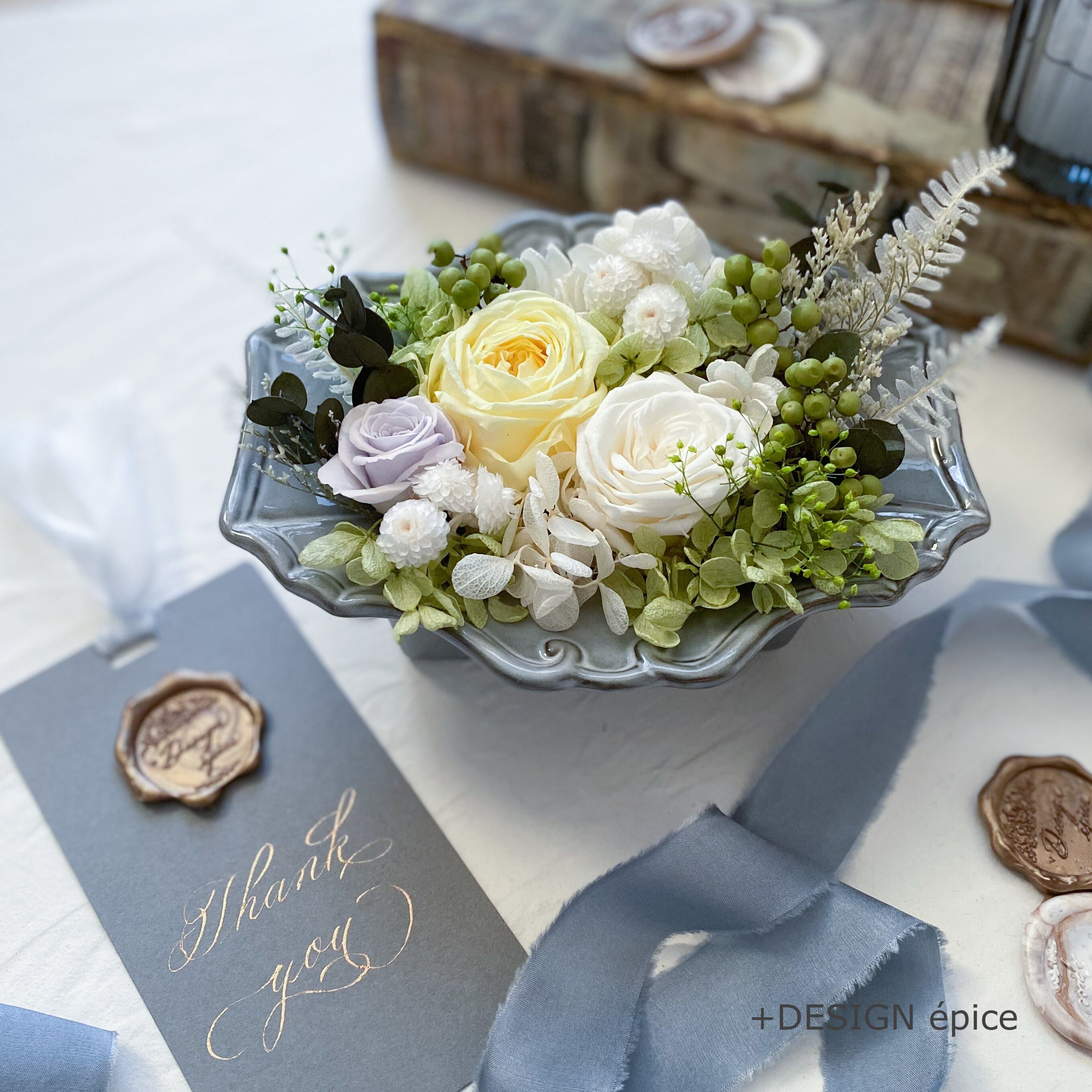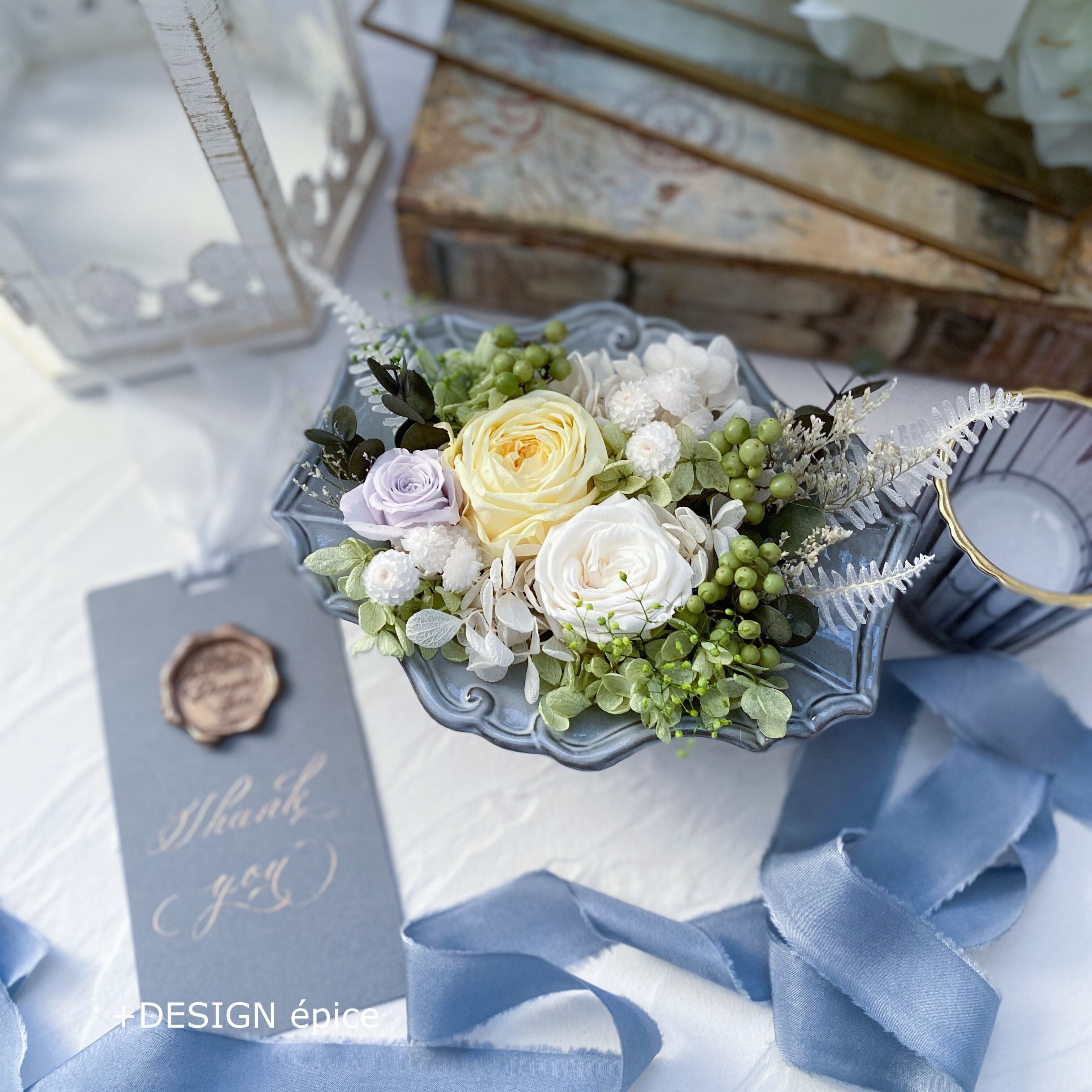 アンティークなグレーの陶器の横長フレームに、イエロー×クリーム×ライトグリーンの色合い